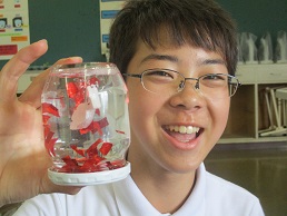 キラキラ光る、手作りのスノードームを作りました。ビンをひっくり返すと魚があらわれ、とてもきれいでした。