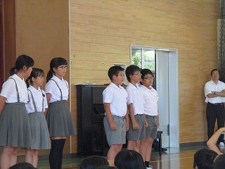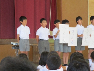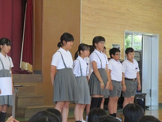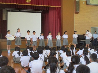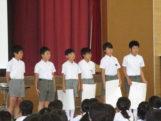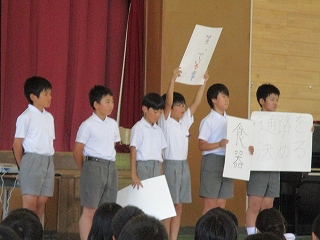 今日の集会で、放送委員会、飼育委員会、給食委員会の発表がありました。