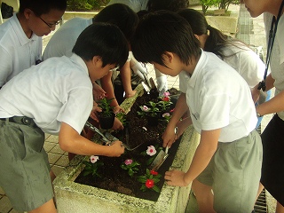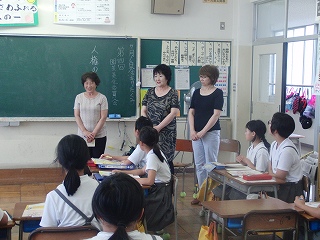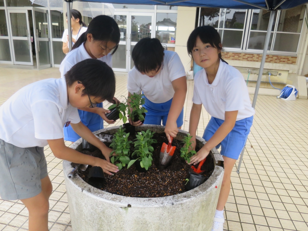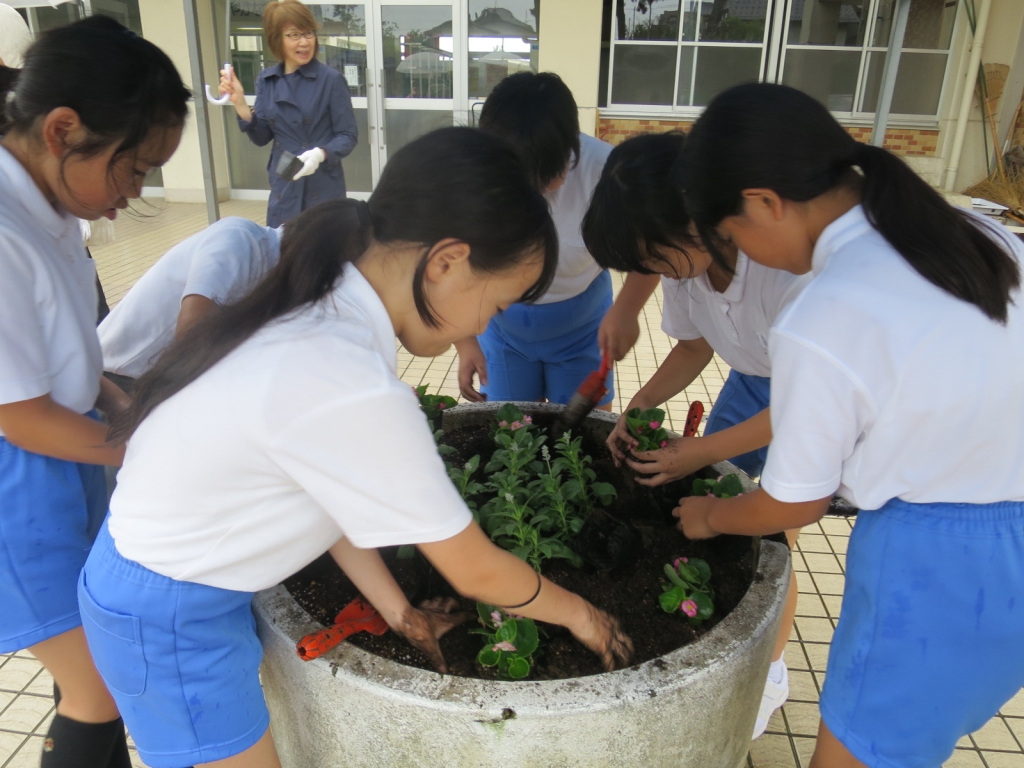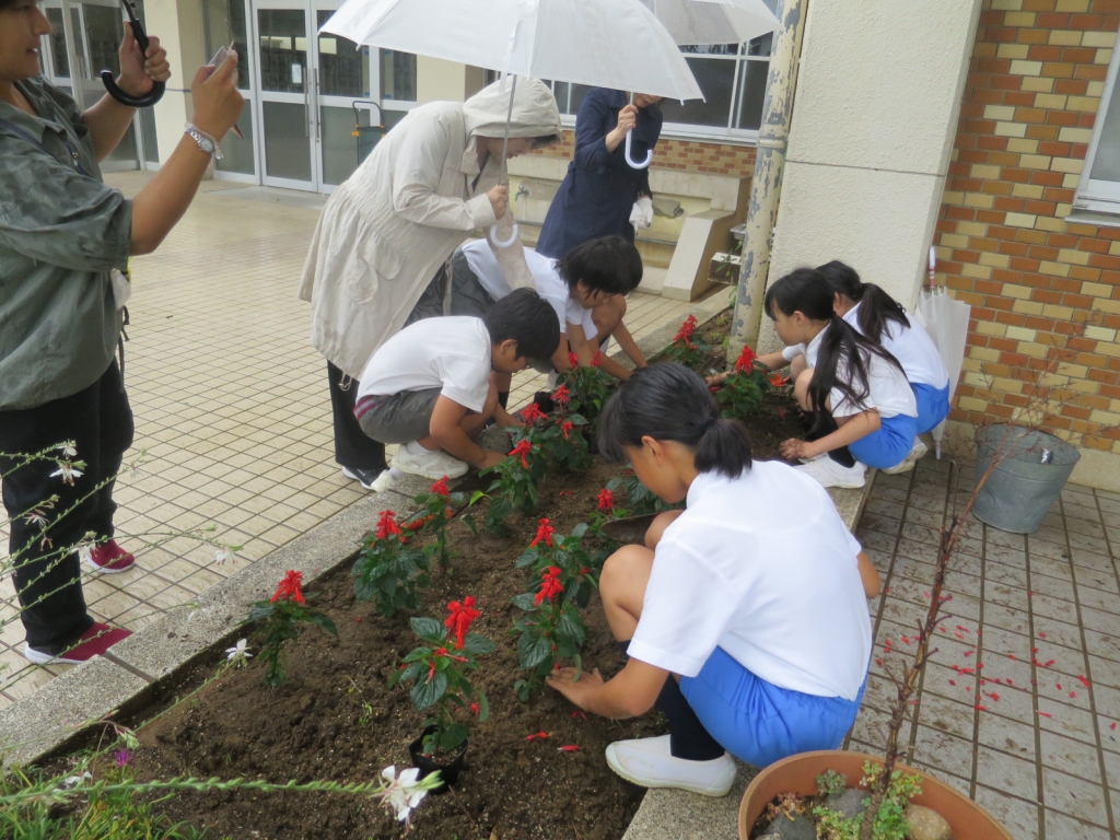 まずは教室で人権のお話を聞きました。そのあと、外に出て花植えをしました。あいにくの雨