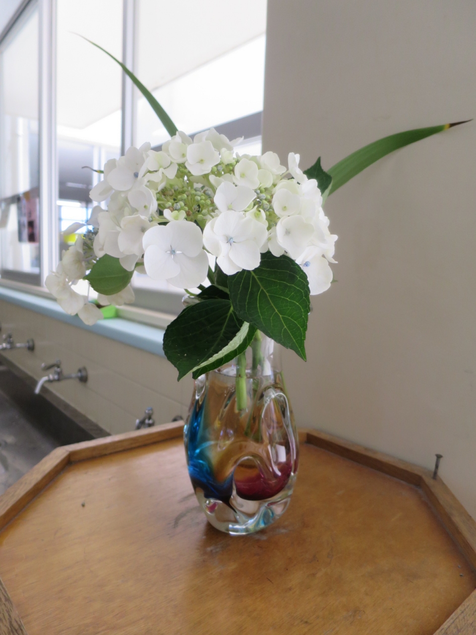 大根布小学校には、来校者を迎える職員玄関や水道周り、相談室等に花が生けられています。