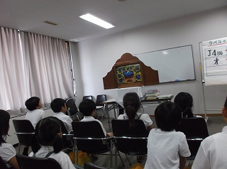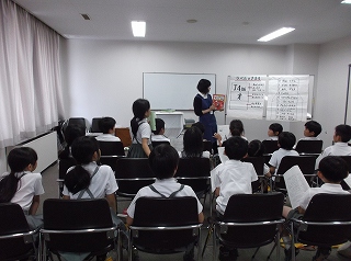 その後、本の分類や図書館の決まりなど、たくさん教えてもらいました。途中のクイズでは、たくさんの子が積極的に手を挙げて参加していました。