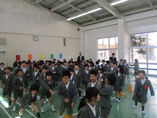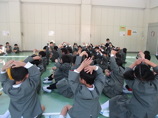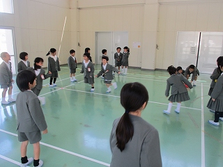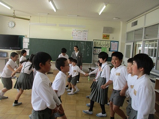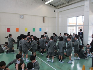 「もうじゅうがり」の歌に合わせて、1、2年生で集まる遊びをしました。楽しそうに集まっていました。