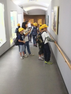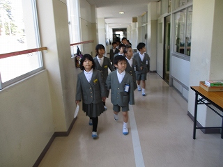 学校の中を手をつないで探検しました。「ここは図工をする部屋です」などと教えてあげている姿も見られました。
