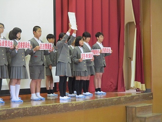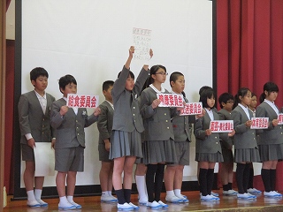 そして、各委員会の委員長、副委員長が児童会目標を達成するための委員会のめあてを発表し、前期の抱負を述べました。笑顔あふれる学校にするために、それぞれの委員会の頑張ろうという意欲が伝わってきました。