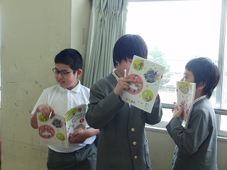 大根布小学校の事をもっと知ってもらうために、クイズを作りました。正解して喜んでいる顔が見られました。