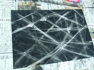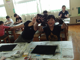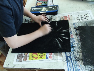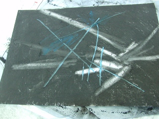「消してかく」・・・ふしぎなタイトルです。画用紙をコンテで黒く塗りつぶし、消しゴムでラインを描くように消します。そのラインを何かに見立てていく、という授業です。みんな作業開始早々に手が真っ黒。