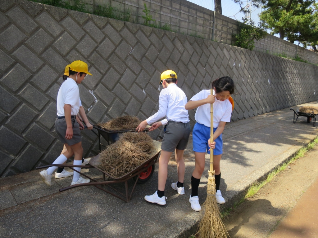 学校ブロック塀下の通学路も松の葉でいっぱいになっていたので、6年生の有志が集まってくれたくさんの落ち葉をかき集めてくれました。