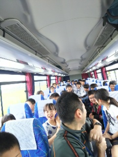 いよいよ出発しました。バスの中では班長が企画したしりとり大会が行われています。ばつゲームの自己紹介が意外な盛り上がりを見せています。
