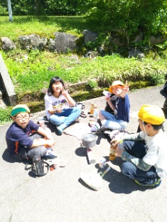 いよいよイワナつかみ。川の中に放されたイワナを捕まえます。子ども達は協力しながら一生懸命、イワナを追いかけました。そして自分で捕まえたイワナを自分でさばき、焼き場へと運びます。