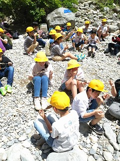 5年生宿泊体験学習の2日目です。この日の活動はイワナつかみ。まずはイワナの生態や捕まえ方のコツなどを教わります。そして、「命をいただく」ということをしっかりと意識するために、イワナのさばき方も教わりました。