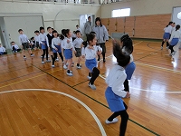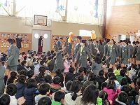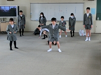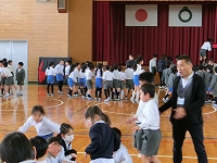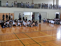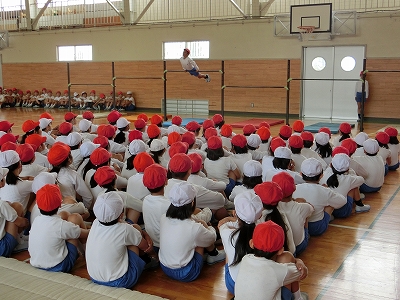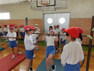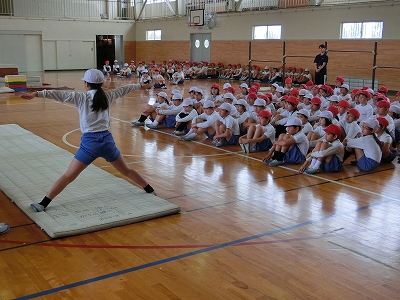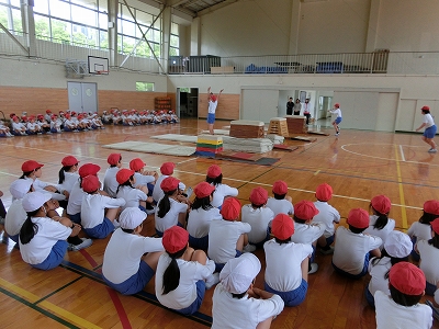 今日は前年度に器械運動交歓会を経験した5年生が交歓会の流れや技を披露しました。