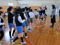 内灘町の4年生が集まり、マット、跳び箱、鉄棒で1人1人全員が技を行います。
