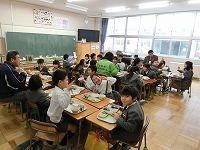 その後、各教室に分かれて、簡単なゲームを行いました。安全ボランティアさんと様々な遊びができて、どのクラスもとても盛り上がっていました。そして、一緒に給食を食べました。いろいろな質問やお話をして、楽しい時間を過ごすことができました。