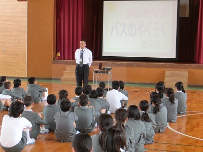今日は高学年のバスマナー集会。