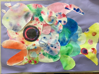 下の魚は、子供たちが描いたためし紙のぼかし、にじみをつなぎ合わせたものです。
