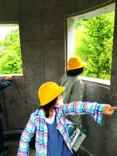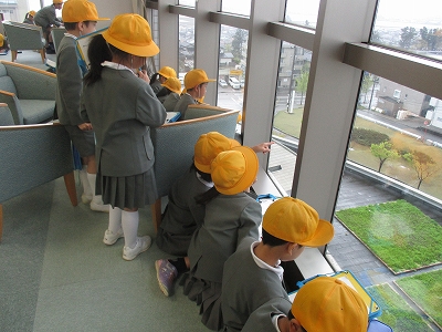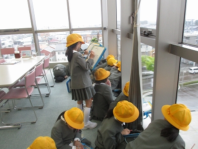 3年生の社会科や総合的な学習の時間には、内灘町の様子について学習します。その手始めとして、内灘町の東西南北にはどんな物があるかを町役場の上層階から調べました。