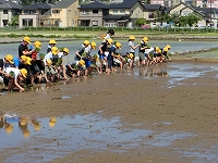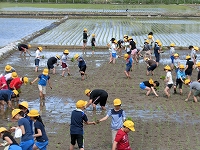 今日は田植えの体験を行いました。自分たちで育てた苗も一緒に植えて、