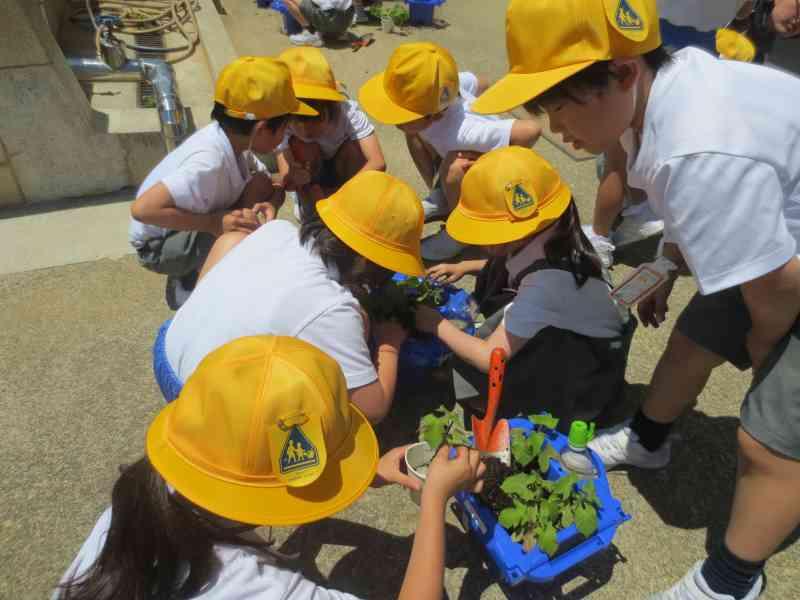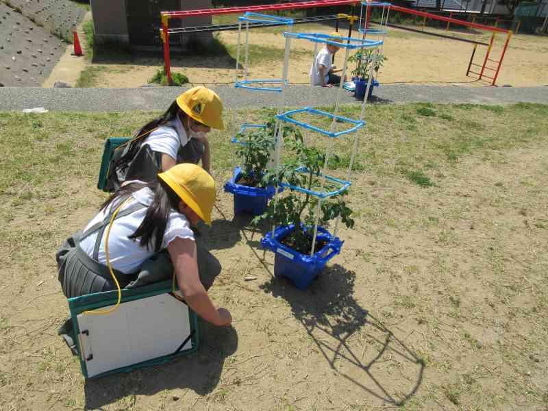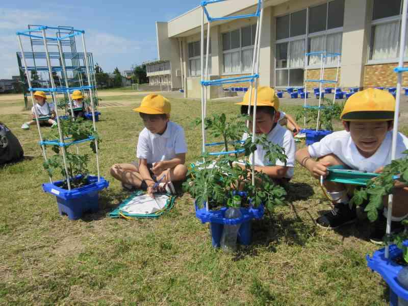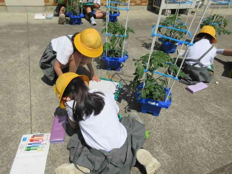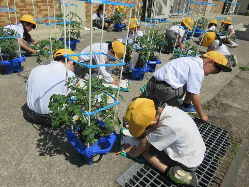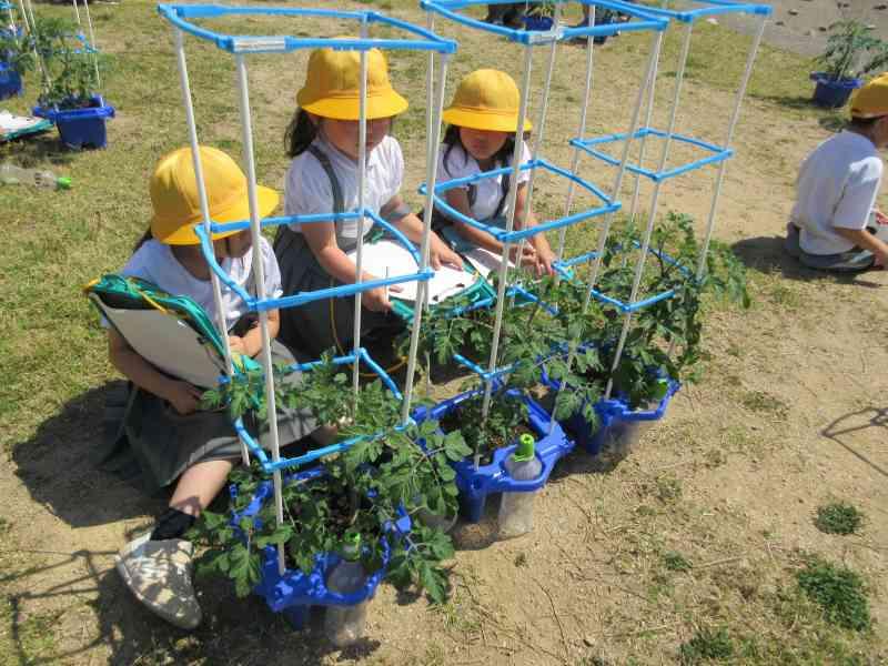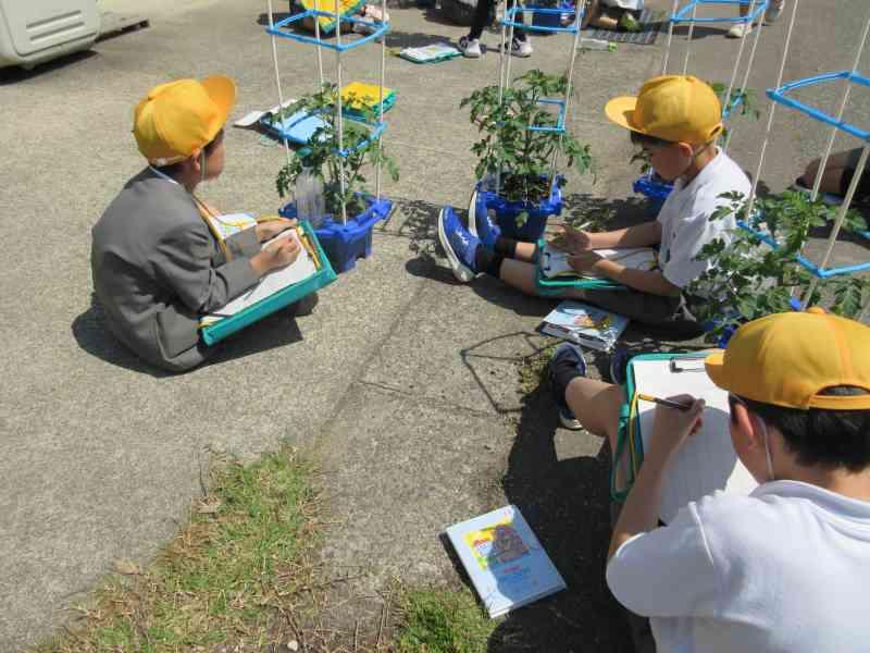 前回の観察から2週間ほど経ち、子どもたちとともにミニトマトの苗も大きく成長してきました。