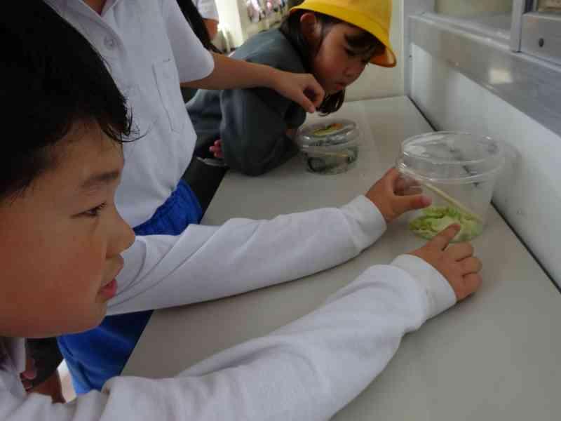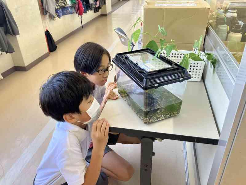 朝の時にはまだ幼虫だった姿が、5限後にはさなぎの姿に変わっていました。発見した子どもたちは大きな歓声をあげ、喜んだり、不思議そうにじっと見つめたりしていました。