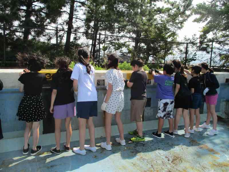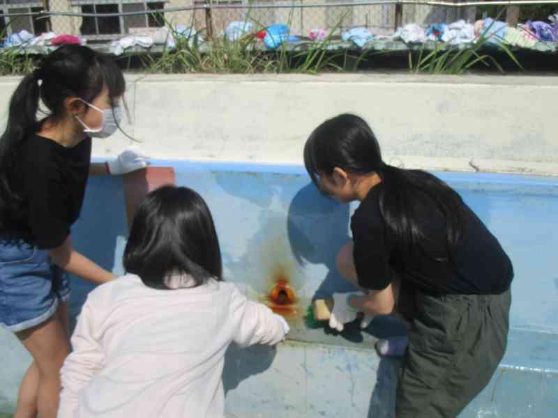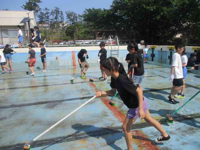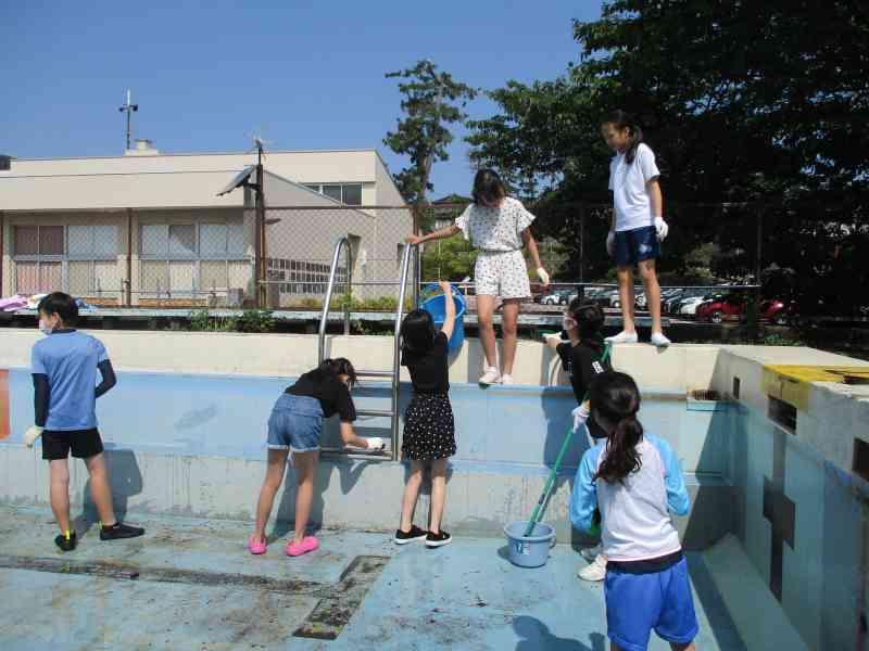 今年も水泳の授業を安全・快適に行うために、プールの壁や床、更衣室やトイレなどを一生懸命きれいにしました。高学年としての自覚をもって、道具を分担し、声を掛け合いながら取り組む姿がとても頼もしく感じられました。