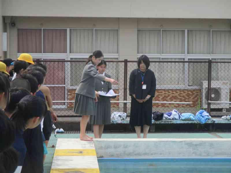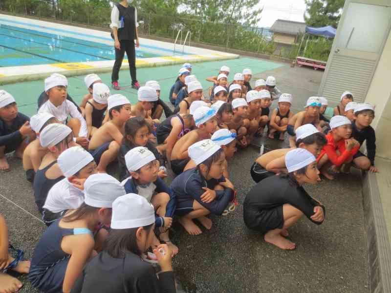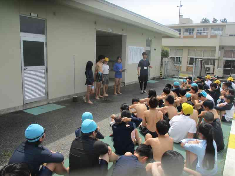 プール開きでは、水に入る前の大切な約束や安全な過ごし方について改めて確認しました。命を守るためにどうすればよいのか、みんな真剣な表情で話を聞いていました。