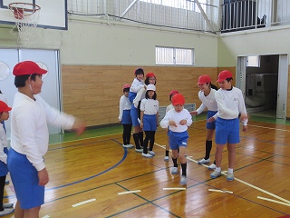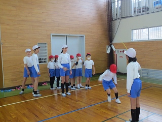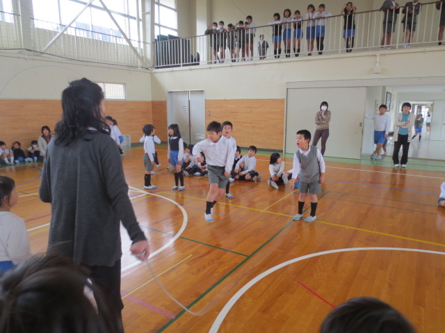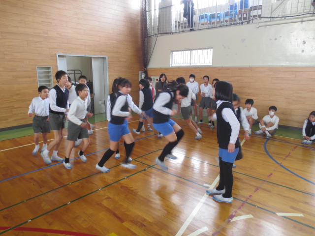 3学期に入り、なわとび運動の充実を図って、1年生に6年生が大縄(8の字跳び)を教えました。「どうやって教えたらいいのかな?」「1年生跳べるかな?」と不安な気持ちで始めた6年生でしたが、どんどん跳べるようになる1年生を見て、「やったあ!」と一緒に喜んだり、ハイタッチをしたりなどとてもいい時間を過ごすことができました。