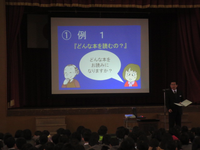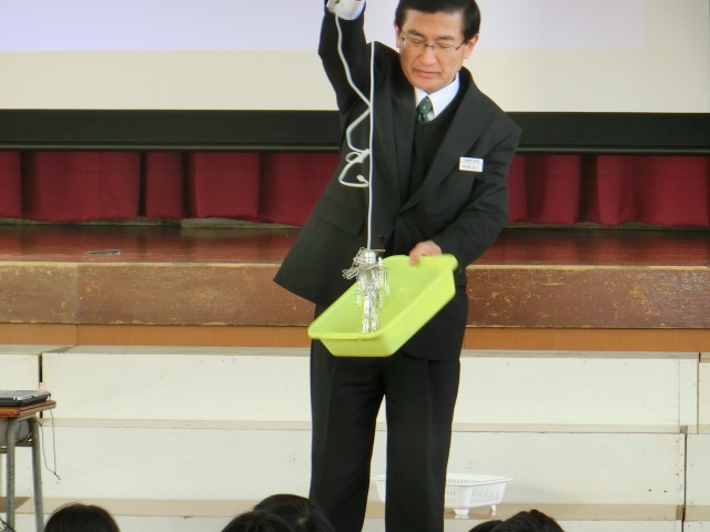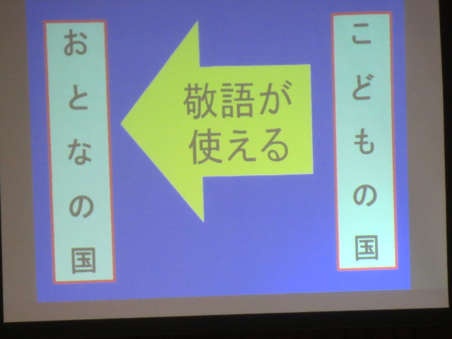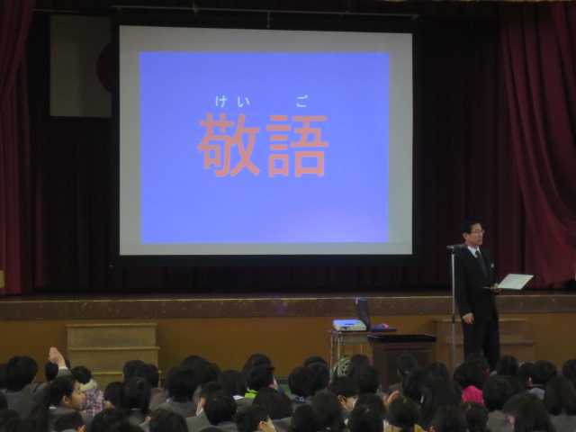 校長先生のお話は『敬語』についてです。正しい言葉を遣うことが人との付き合いをより円滑にすること、これから大人に近づいていくときに本当に必要な力であると話して下さいました。クイズを交えながらの話に、子ども達は最後まで真剣に話を聞くことができていました。