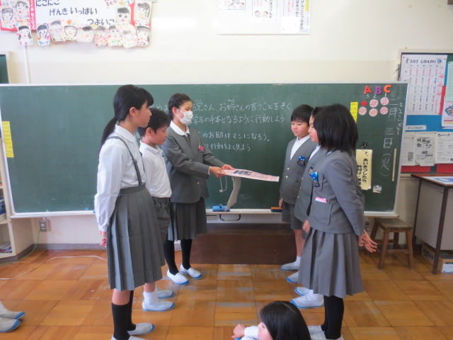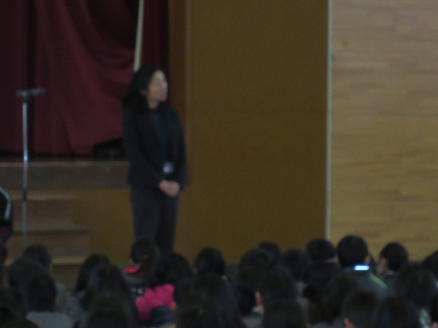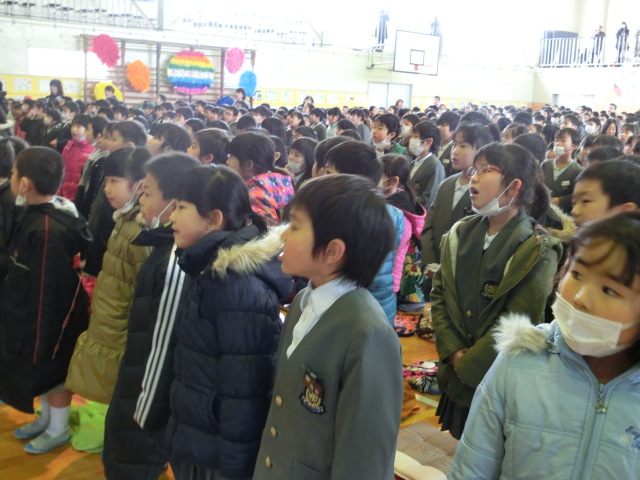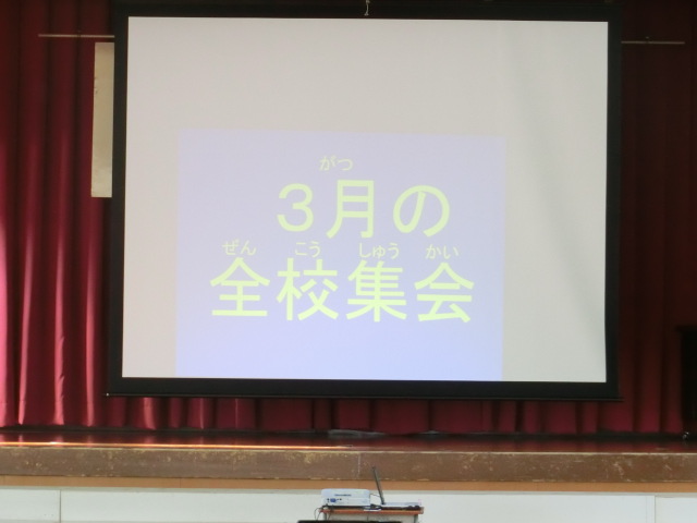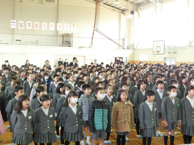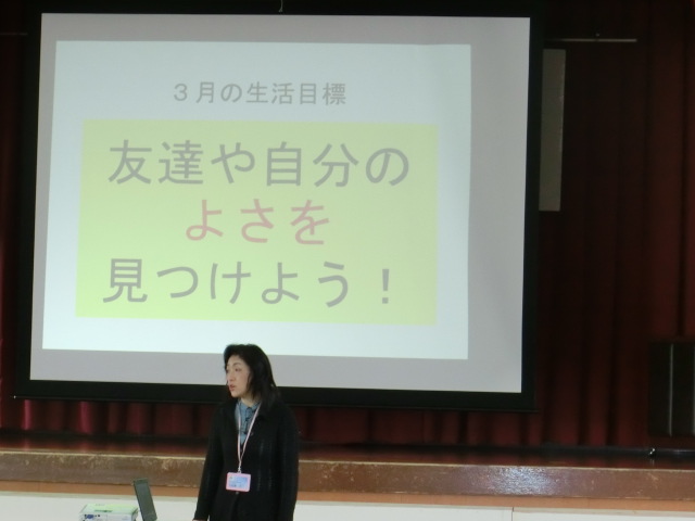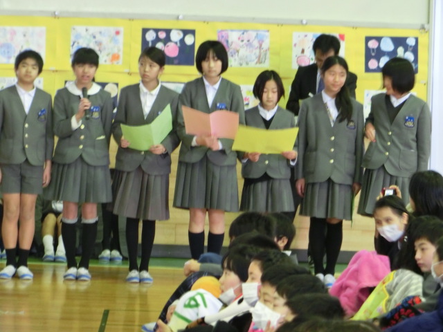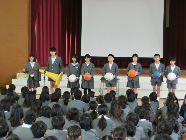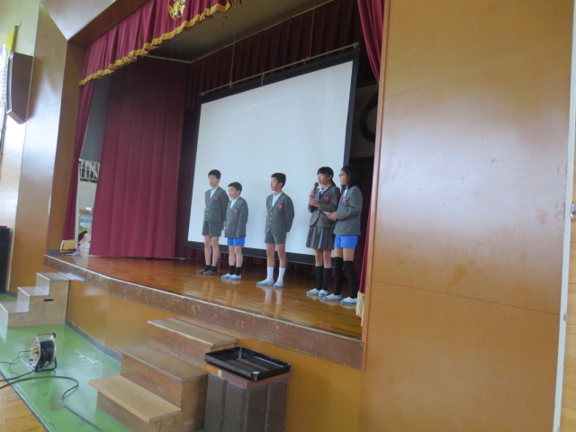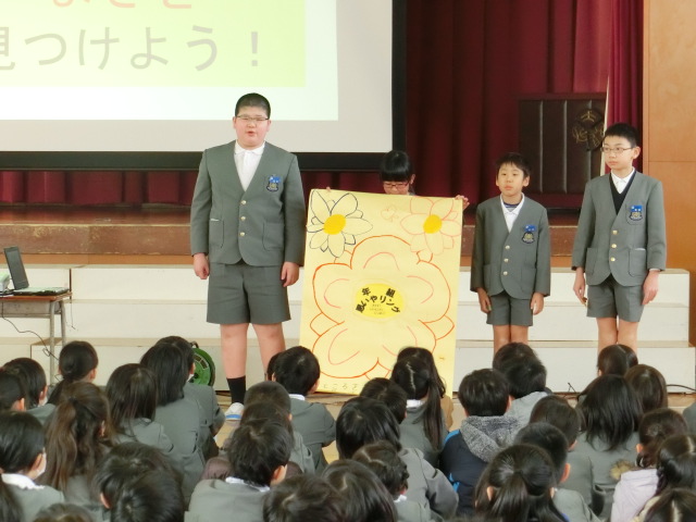 次に、今月の生活目標『感謝の気持ちを伝え合おう』について、生徒指導部の先生からお話がありました。毎日の生活の中で、いろんな方にお世話になっていること、その気持ちをしっかり伝えていきましょうというお話でした。2月27日には「6年生大感謝祭」が行われます。ありがとうでいっぱいの学校にしていけるといいですね。