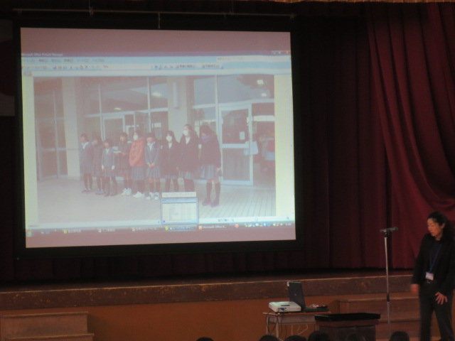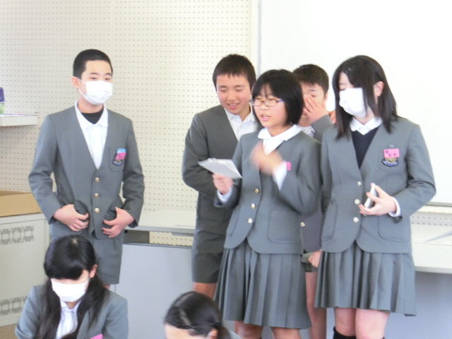 校歌を紹介し、続いて、学校生活の様子や1年間の行事をグループごとに発表しました。