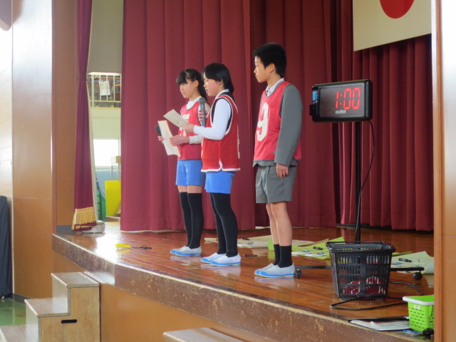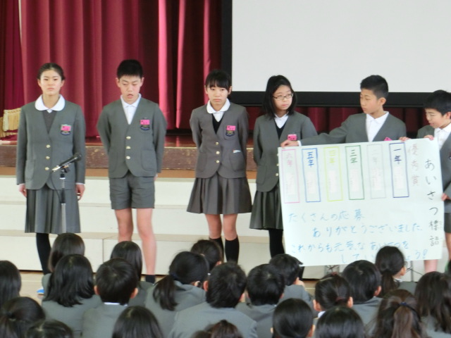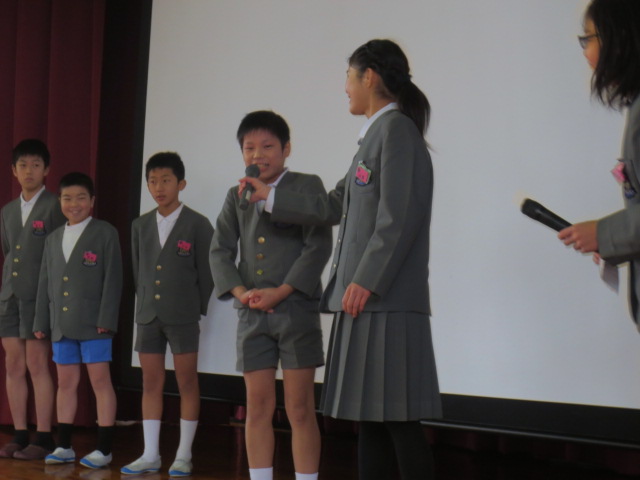 その後行われた児童集会では、企画委員会から「あいさつ標語」について、体育委員会から