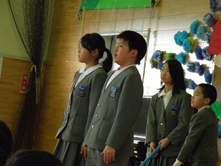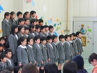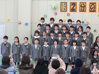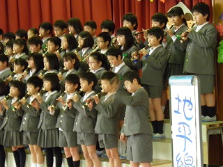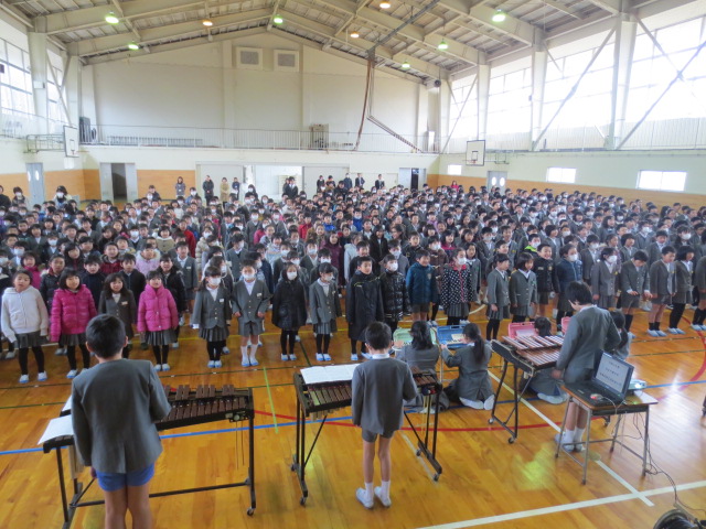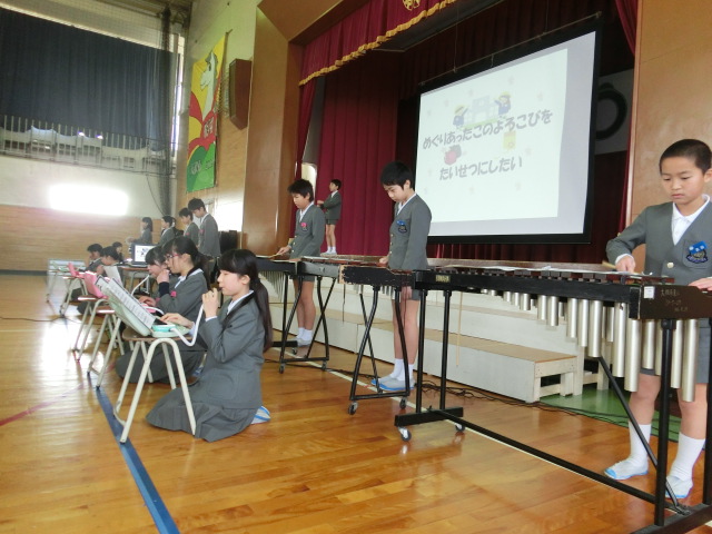 最後は今月の歌です。卒業式にも歌いますが「君に会えて」を音楽委員会の演奏で歌いました。みんな大きな口を開け、本当に元気よく歌うことができましたね。