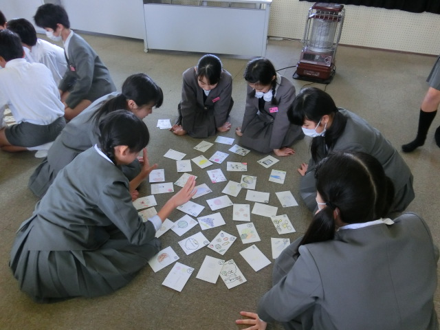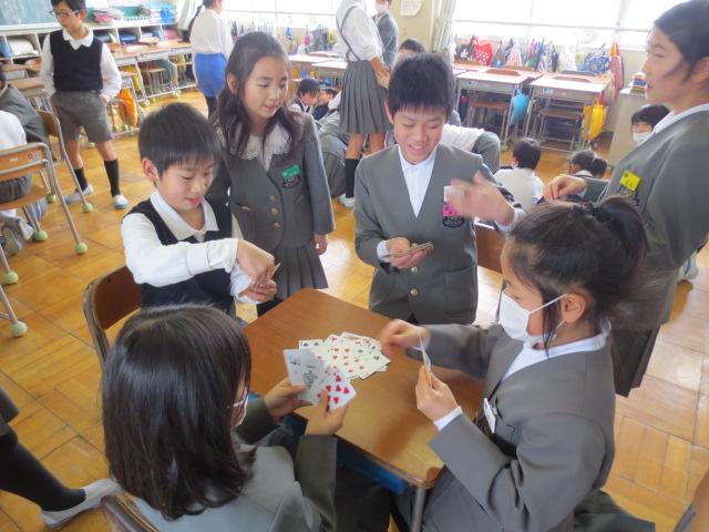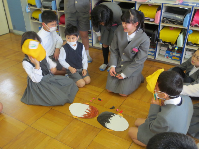 冬の遊びにちなんでトランプやカルタをするグループ、手作りの福笑いをするグループも