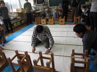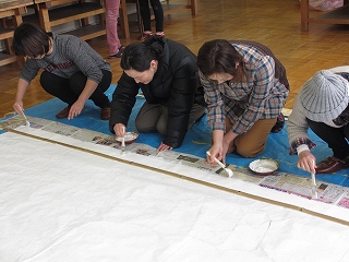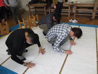 平成27年度の「世界の凧の祭典」に向けた大凧作成の1回目が、8日(日)に凧の会のみなさん、PTA執行部、育体部と教職員で行われました。