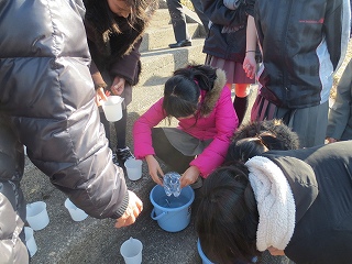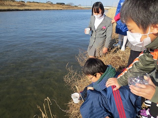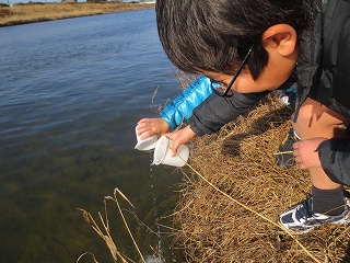 2月16日6時間目 飼育委員会でサケの稚魚の放流を行いました。