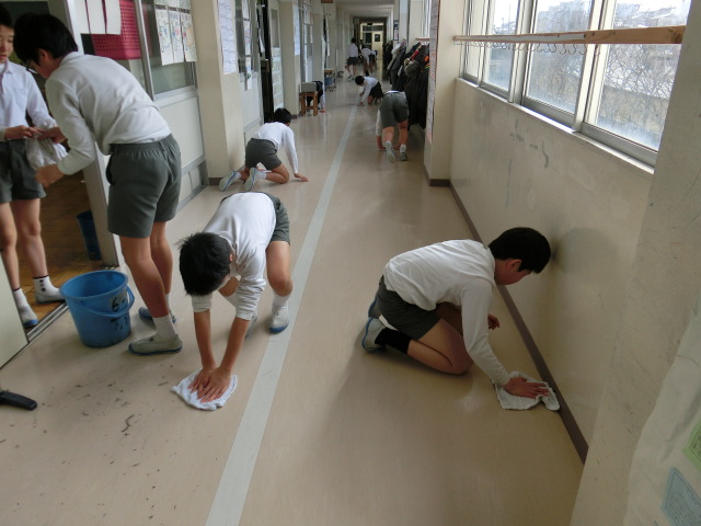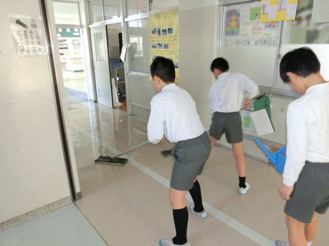 6限後、まずはワックスをかけるためにろうかをきれいに掃除をします。どの子も静かに