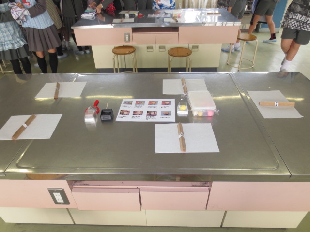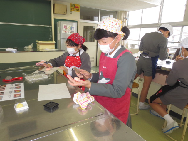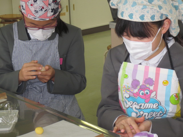 お越しいただき、卒業記念品の和菓子を作りました。初めての体験に子ども達は戸惑いな