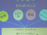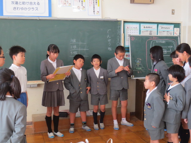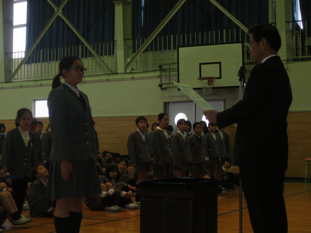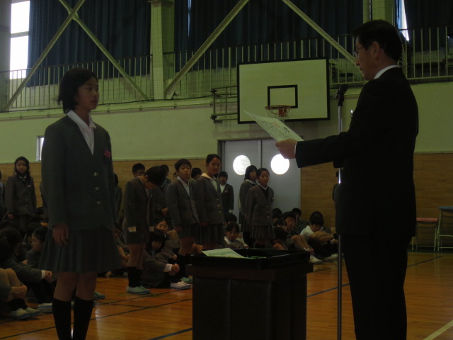 初めに、今年度の書写作品、図画作品の表彰を行い、校長先生から代表児童に賞状を渡していただきました。