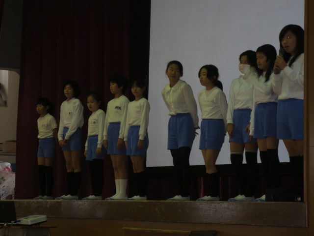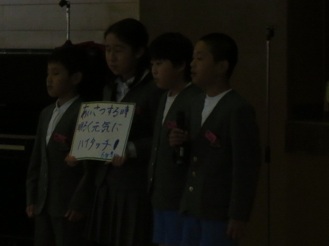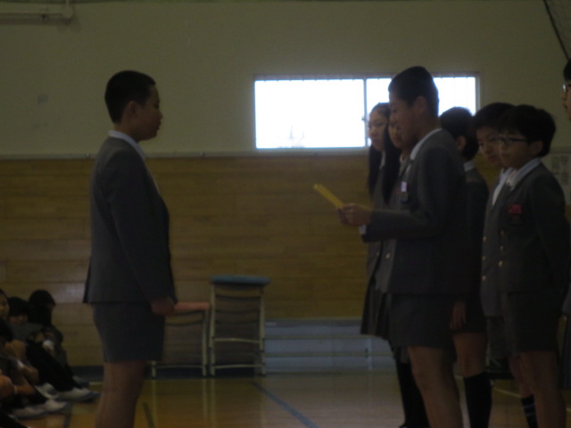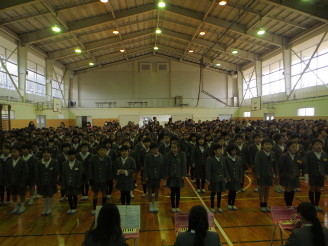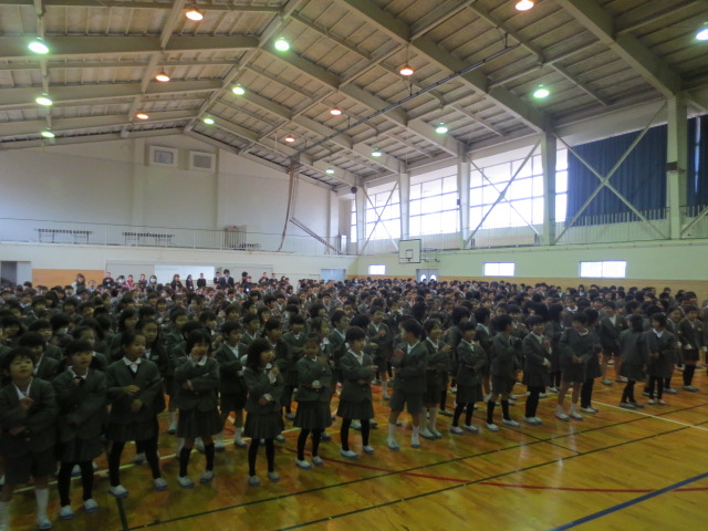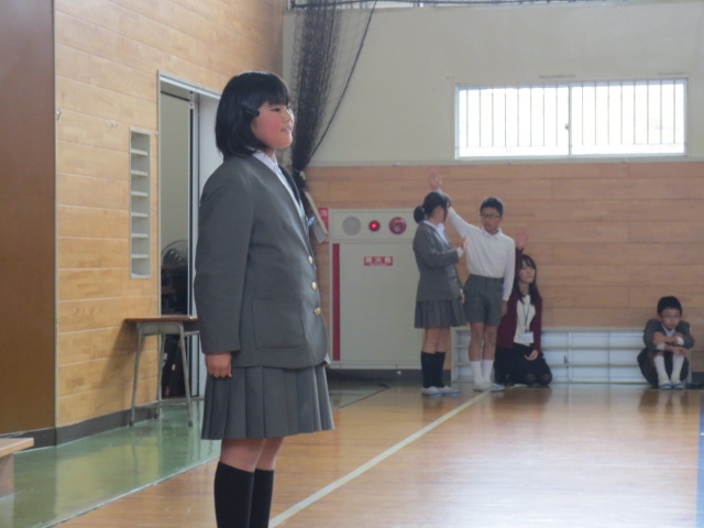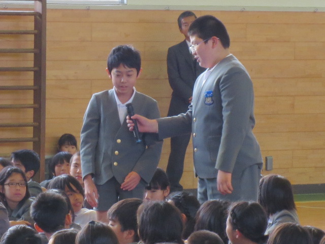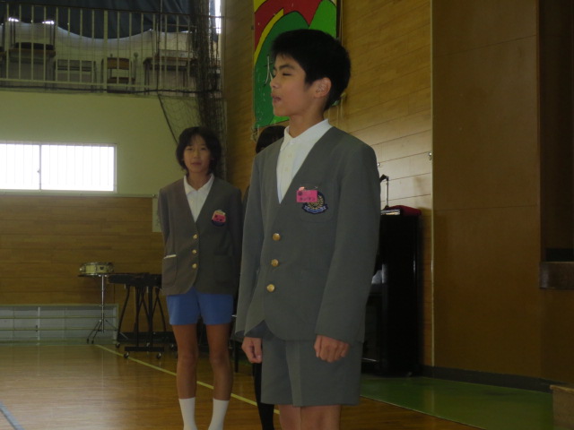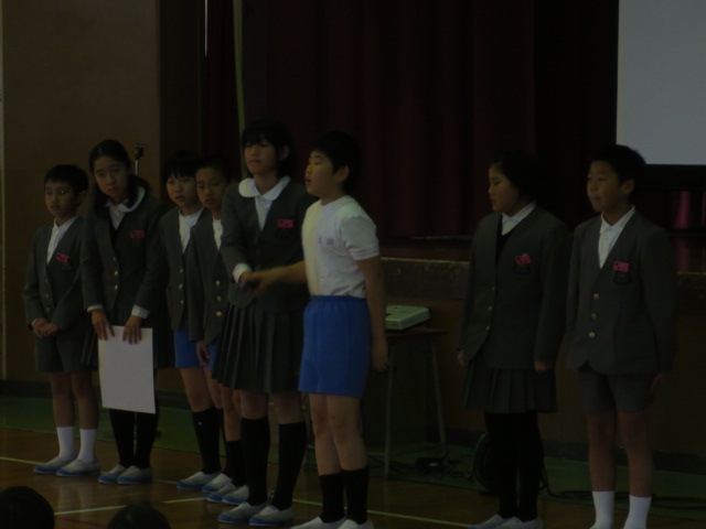続いて生徒指導部の先生から、12月の生活目標「はげましあって やりきろう」についてお話がありました。6年生の3クラスが全校を代表して、各クラスの目標を発表しました。今年最後の一ヶ月です。みんなで協力して、やり切って行きましょう!
