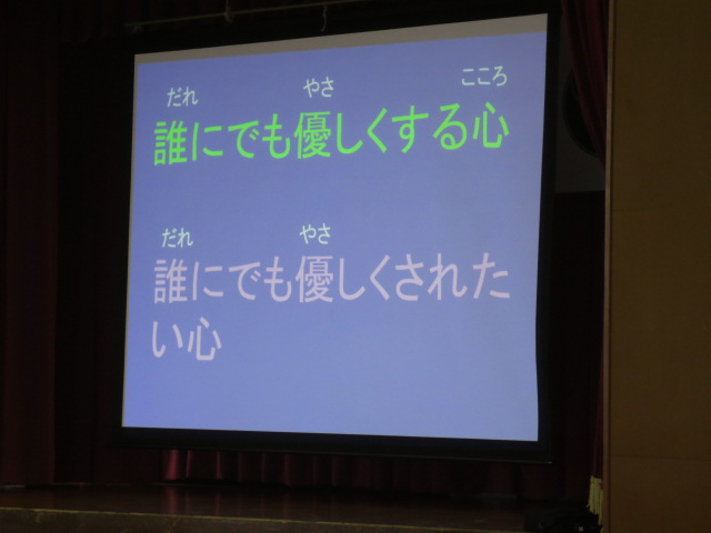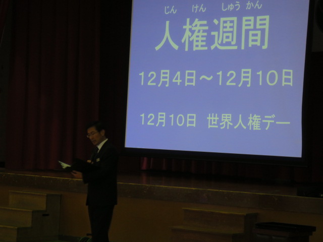 次に校長先生のお話です。今月は12月4日~10日までの人権週間に合わせて、人権の大切さについてお話していただきました。話の中心は「いじめ」についてです。「わがみをつねって、人の痛みを知れ」「困っている人を見かけたら助けてあげる。これは当たり前!」など、本当に大切なことをたくさん教えていただきました。校長先生ご自身の体験談もあり、児童は真剣に耳を傾けていました。
