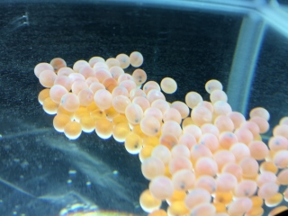 一粒一粒の小さな卵の中に黒い目が透けて見えます。