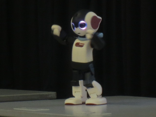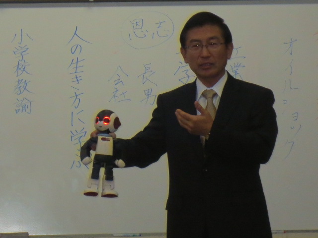 校長先生が子どもの頃の夢を実現させたロボット。校長先生の声に反応し、手を振ったりダンスを踊ったりといろいろな動きができます。子ども達からは「かわいい!」「すごい!」と大きな歓声が上がりました。