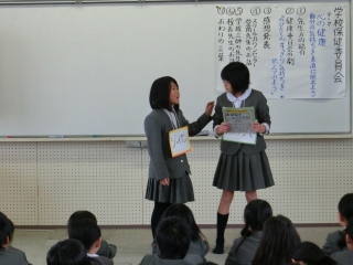 前期・後期の健康委員会の児童が、「のびたくん、すっきり気持ちを伝えてみよう」という劇を行いました。劇は、アサーショントレーニングの内容で、ジャイアンから本を貸してと言われたのびた、スネ夫、しずかの答え方から、それぞれ相手にどんな気持ちが伝わるかについて考えるというものです。劇の後にスクールカウンセラー堂前先生からお話を聞き、また学校三師の高学校医、中本歯科医、松浦薬剤師から助言をいただき、5年生児童は、普段の言葉づかいをふりかえり、自分も相手も大切にできるコミュニケーションの大切さや、心の状態が体調に影響を与えることを知り、お互いに思いやる心をもてるようにしようと感想を持ちました。