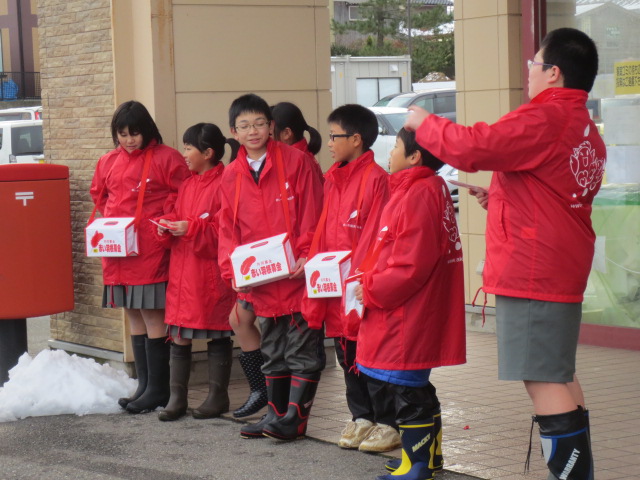 12月15日(月)の放課後、内灘町社会福祉協議会の方と一緒に、アルビス前にて「赤い羽根共同募金活動」を行いました。冷たい風が吹き付ける中でしたが、「ご協力お願いします。」「ありがとうございました。」と元気な声で呼びかけたり、お礼を言ったりすることができました。たくさんの方の善意に触れ子ども達も笑顔で活動を終えることができました。本当にいい経験ができました。