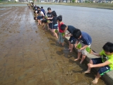 今年の5月に、高道 栄治さんのご指導のもと、5年生は田植え体験をしました。初めて体験する子も多く、素足で入る田んぼの感触に何とも言えない表情をしている子もいましたが、田植え体験を通して米作りの大変さを学びました。