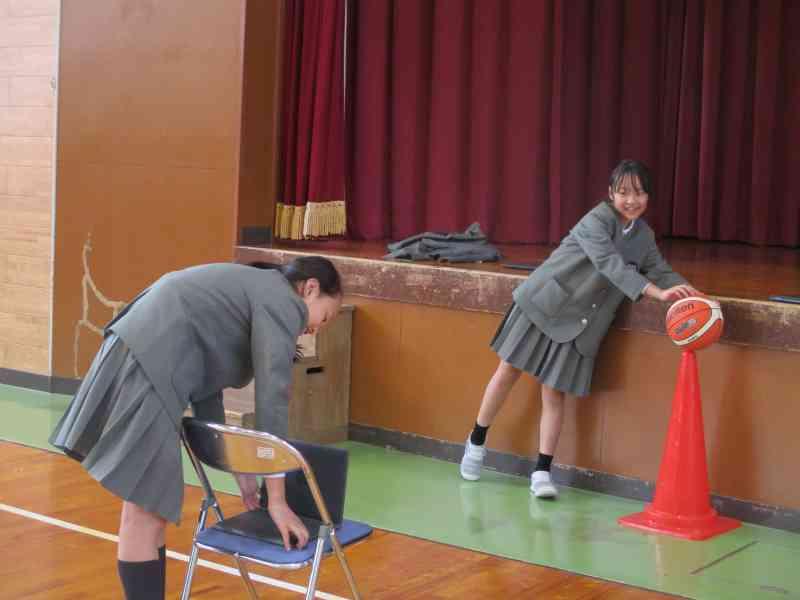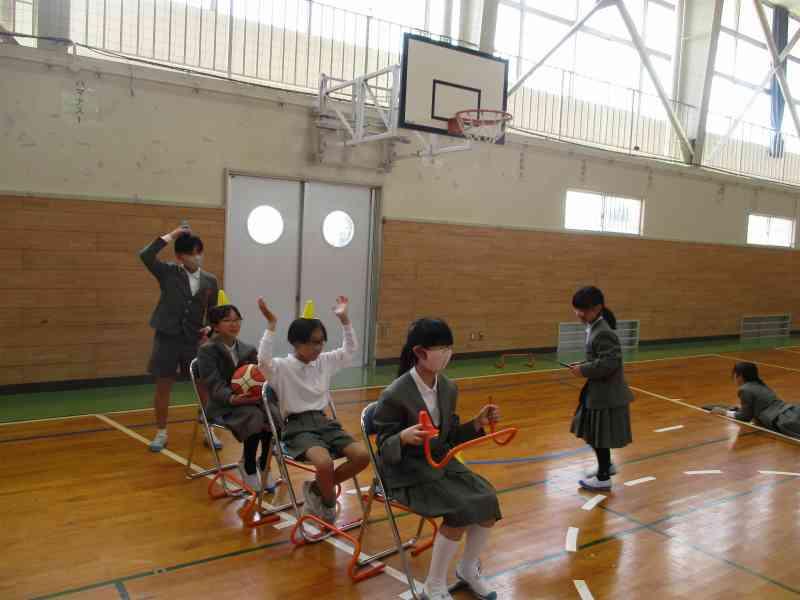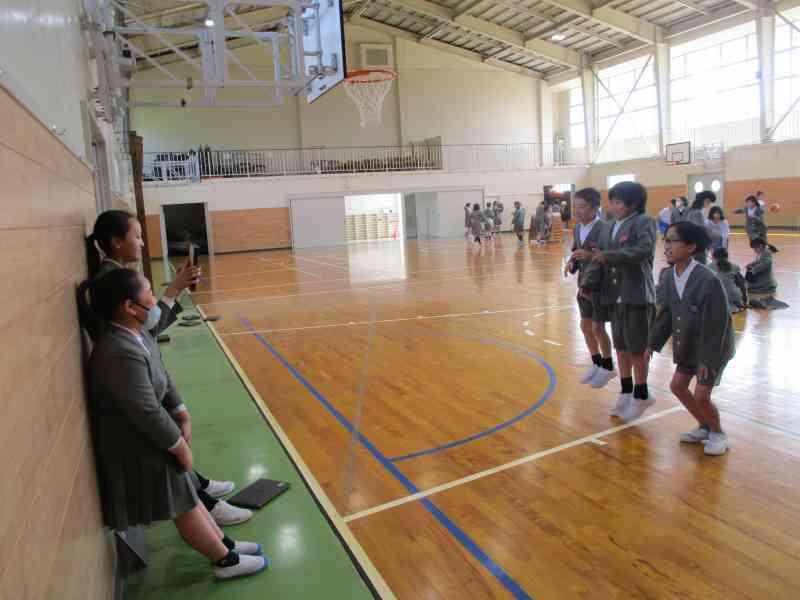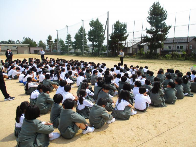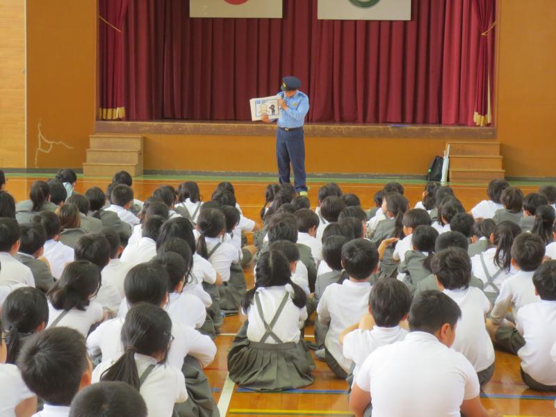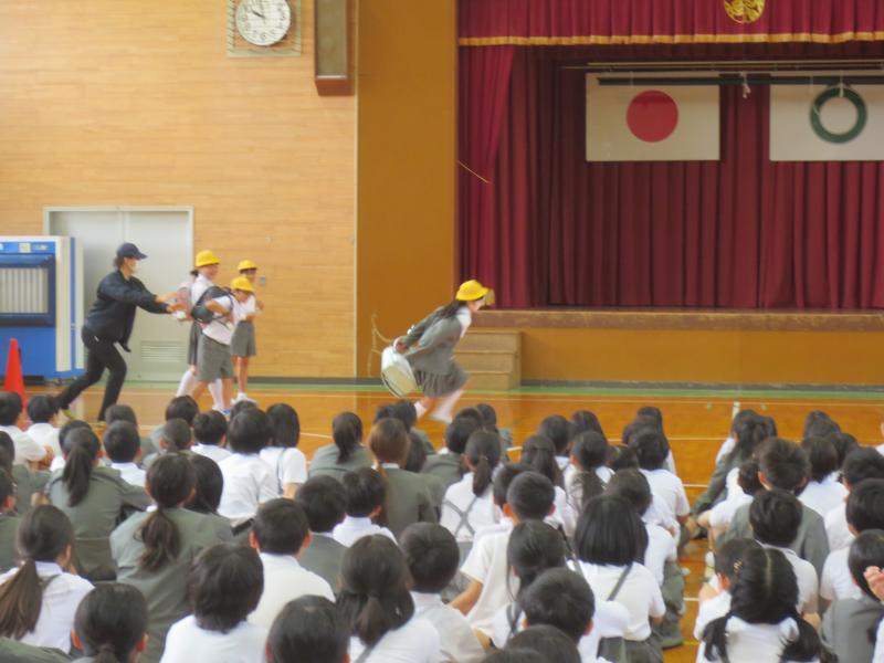 体育館へ二次避難し、その後警察の方から「いかのおすし」についてお話を聞き、5年生の代表の児童が逃げる練習をしました。