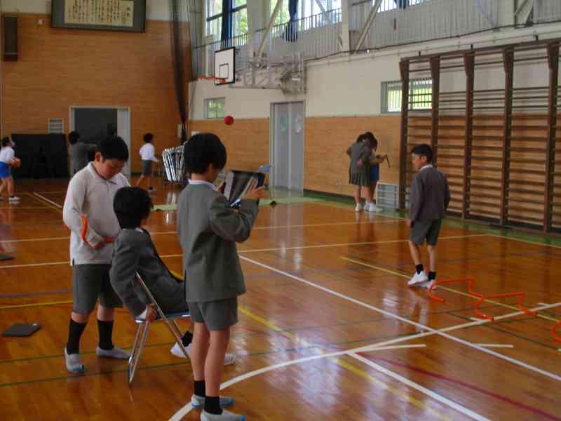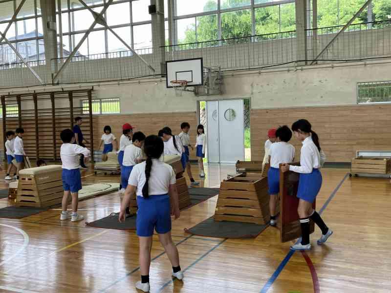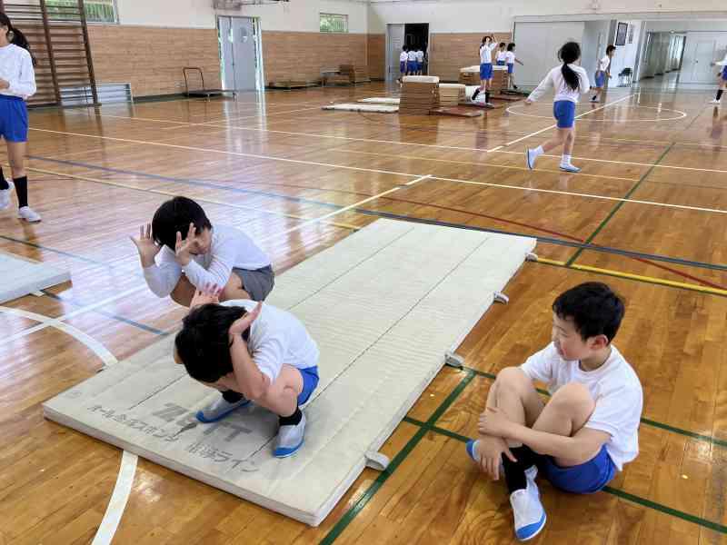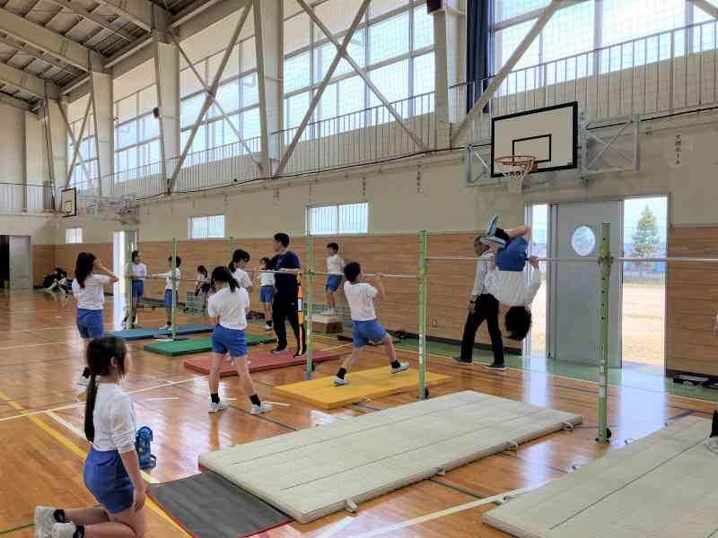 今週は5年1組と4年生、5年2組と4年生と、それぞれのクラスで4年生に器械運動を教えました。