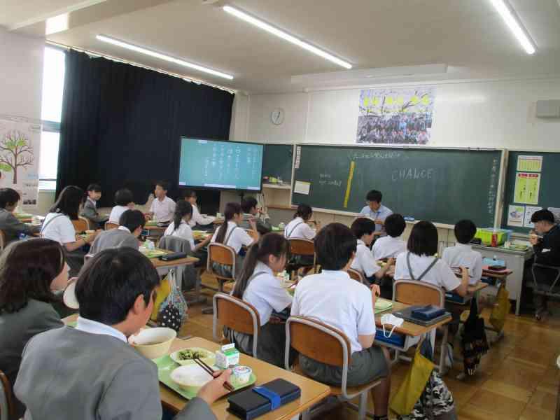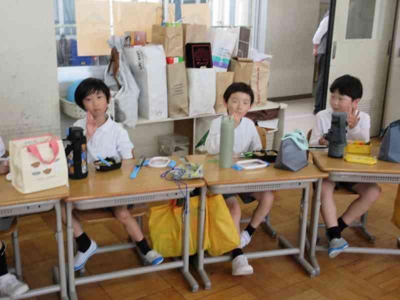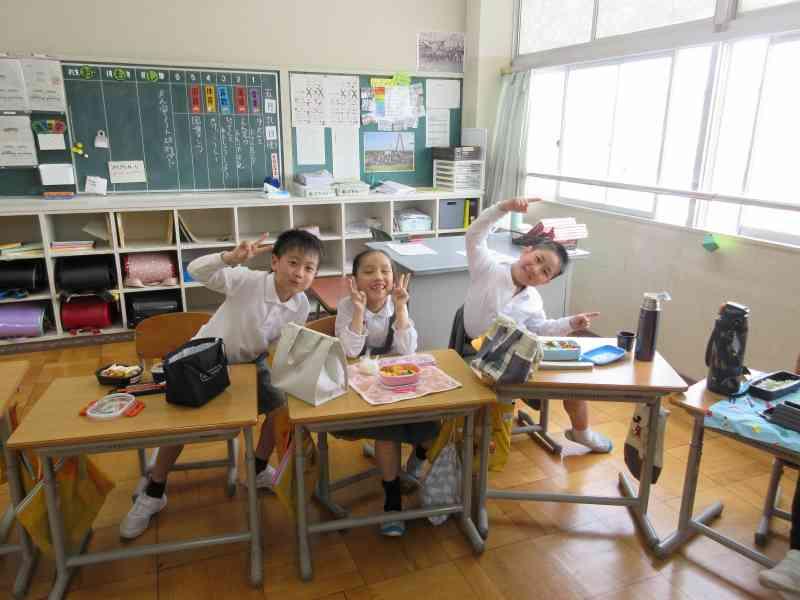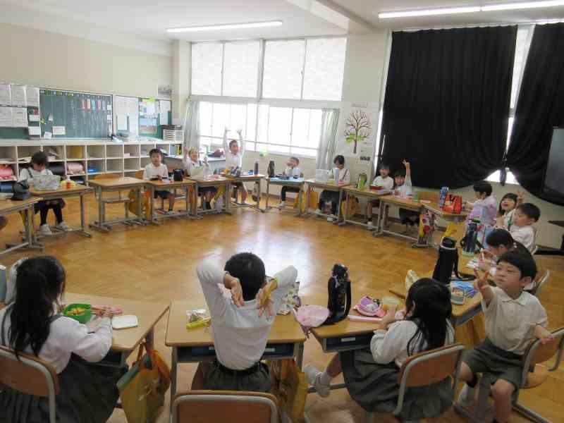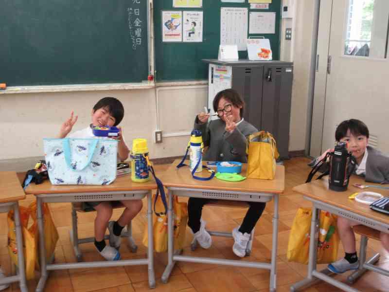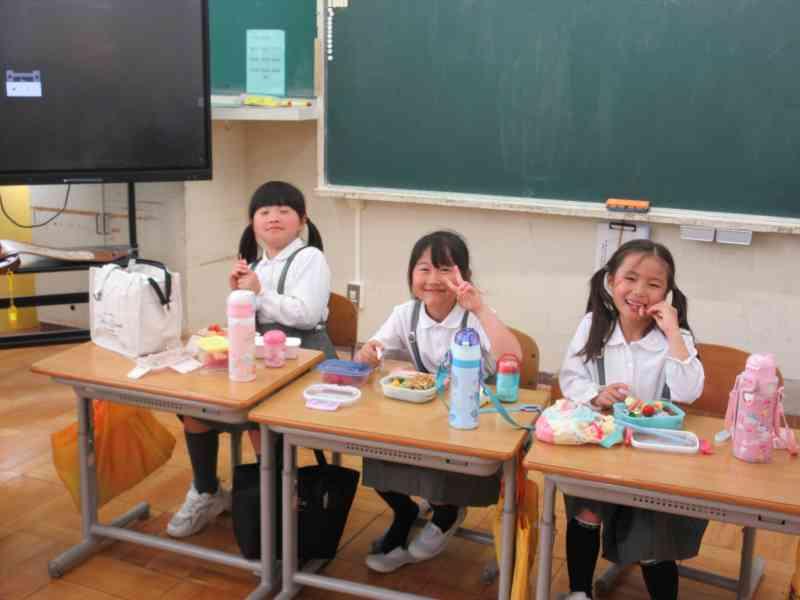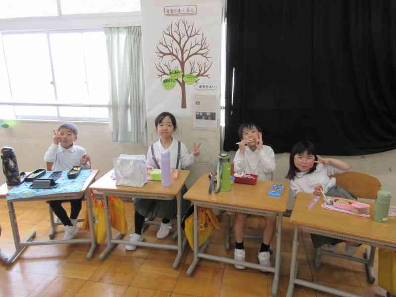せっかくのお弁当、みんなで輪になって食べました。いつもと同じ場所だけどちょっと違う給食時間の雰囲気を味わいながら、楽しく食べていました。