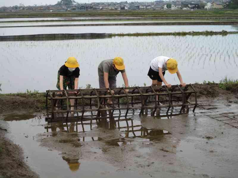 まずは代表3名が田んぼに入り、苗を植える目印を付けました。