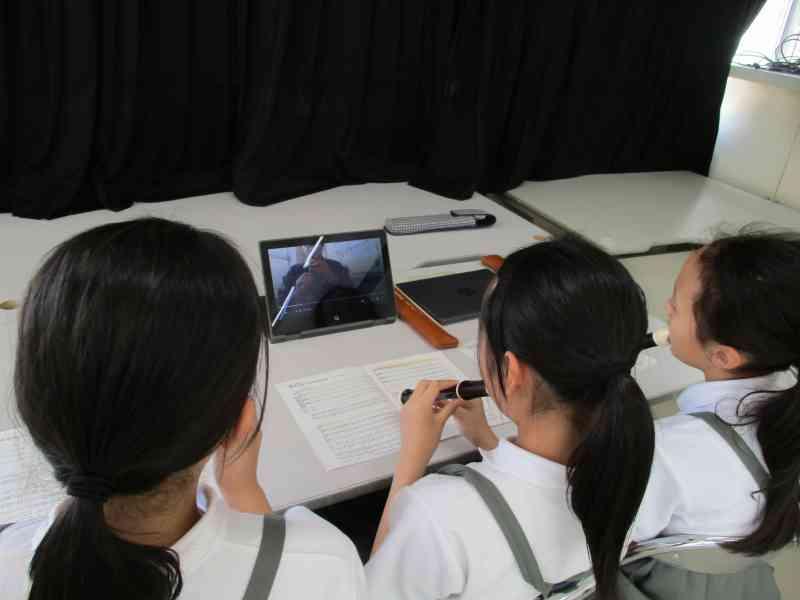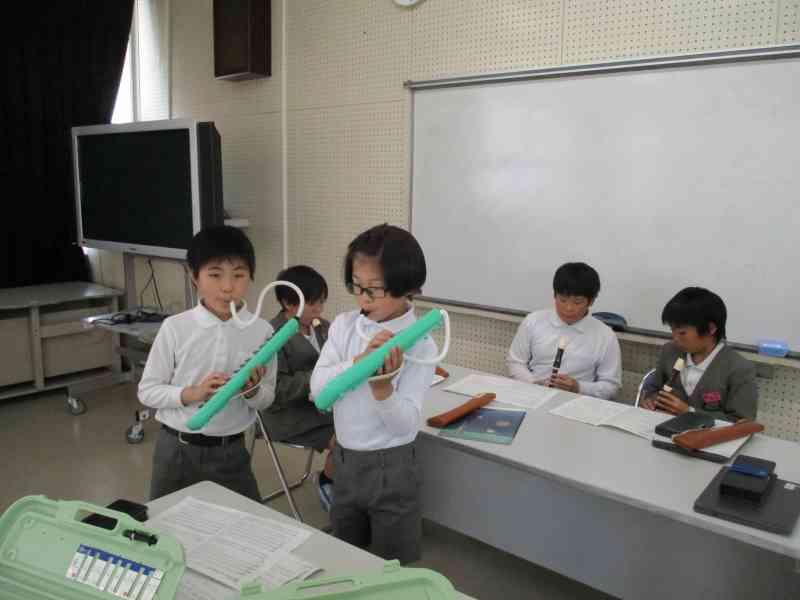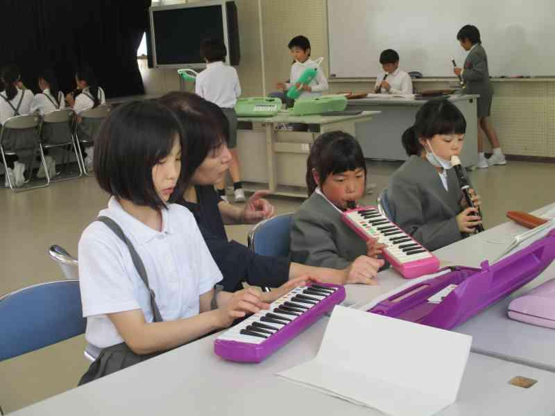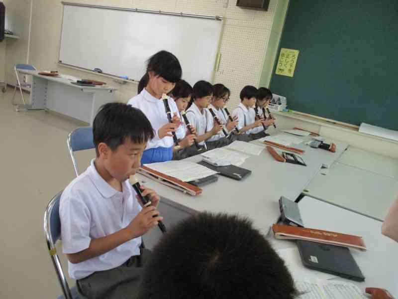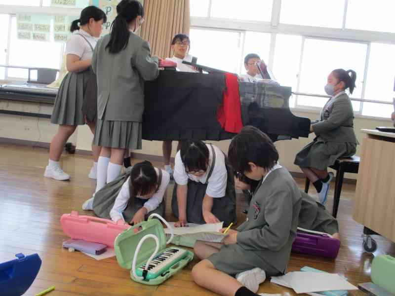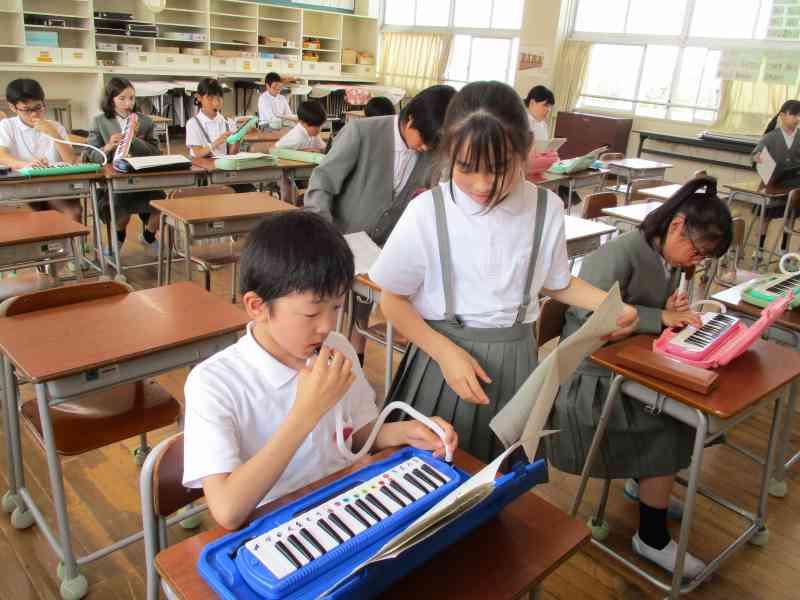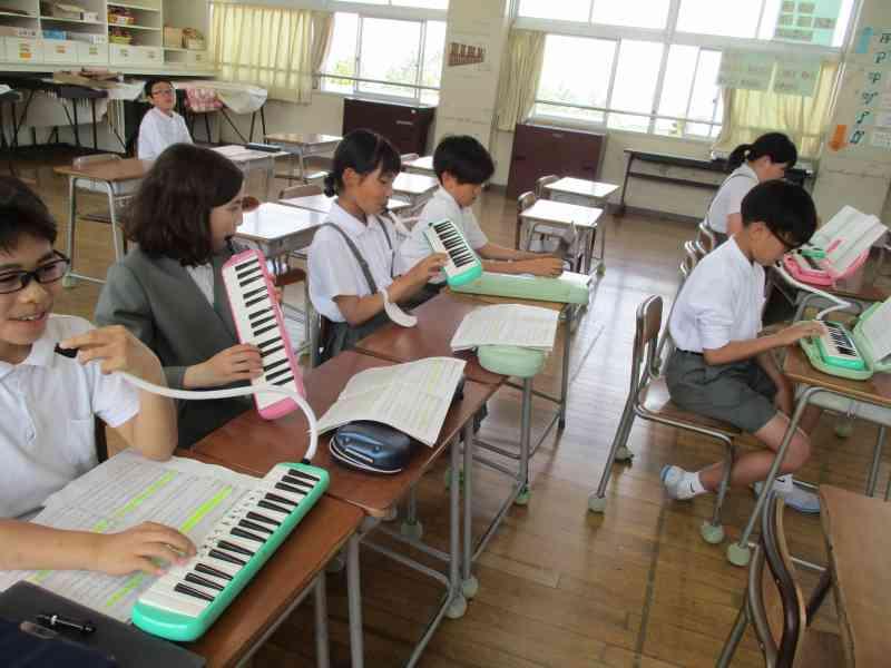 5年生全員に楽譜が配られ、自分たちで音階を確かめて記入しました。
