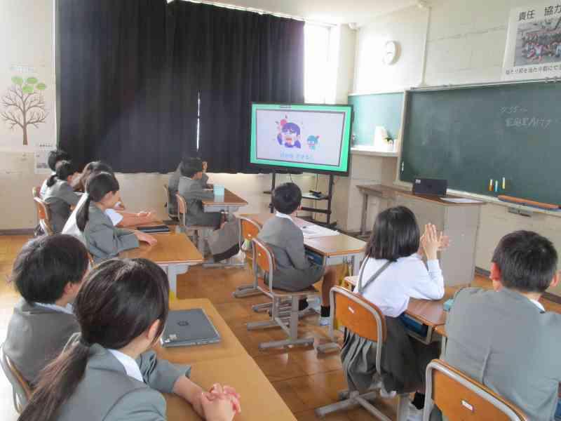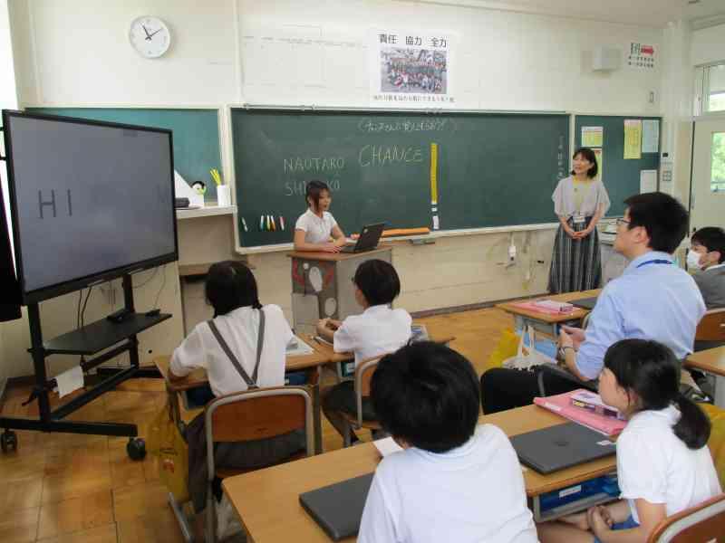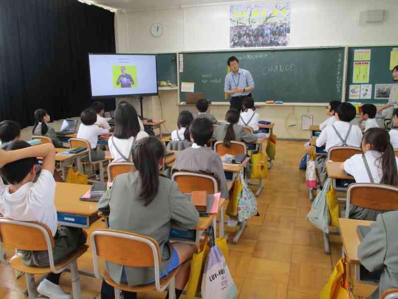 チャンスさんに英語で自己紹介をし、好きな食べ物や教科を伝えました。